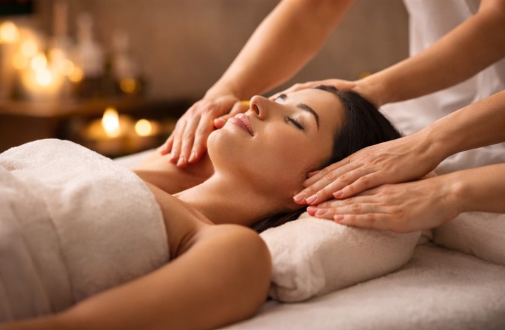Masaje sensorial a cuatro manos que favorece la relajación profunda, ayudando a liberar tensiones y generar una sensación global de descanso y bienestar.